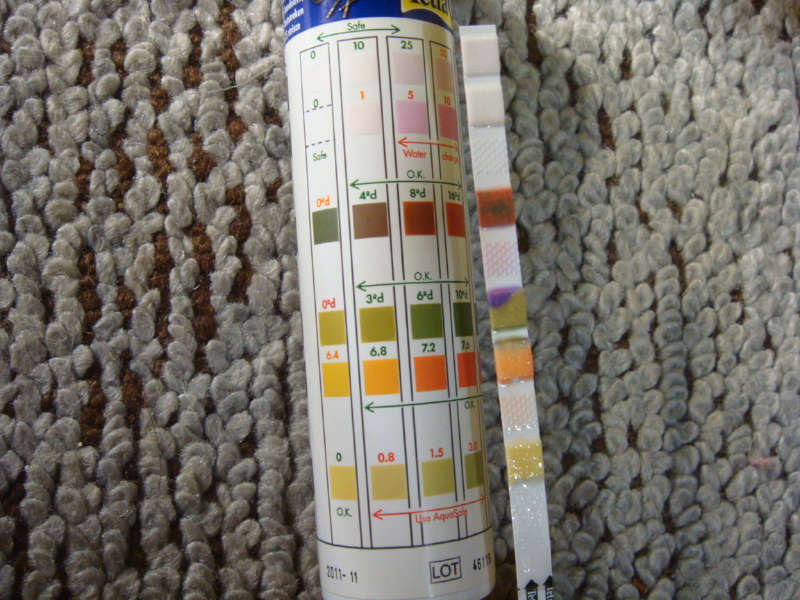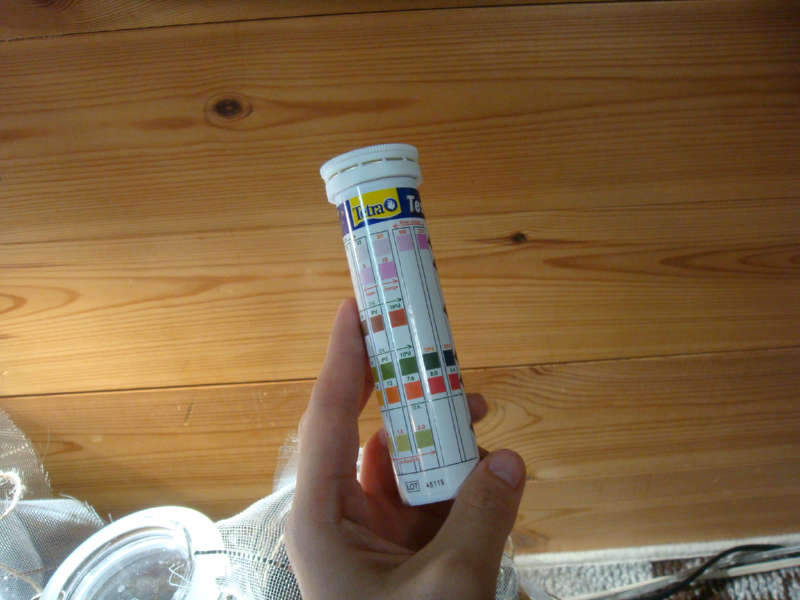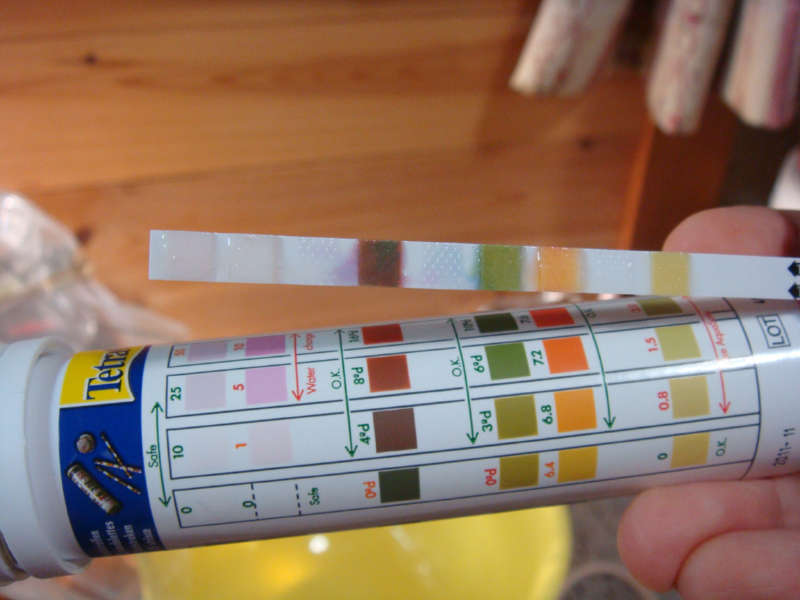 Cl2は0、pHは6.8、KHは3°d、GHは4~8°dの間、NO2-は0~1の間、NO3-は10~25の間。