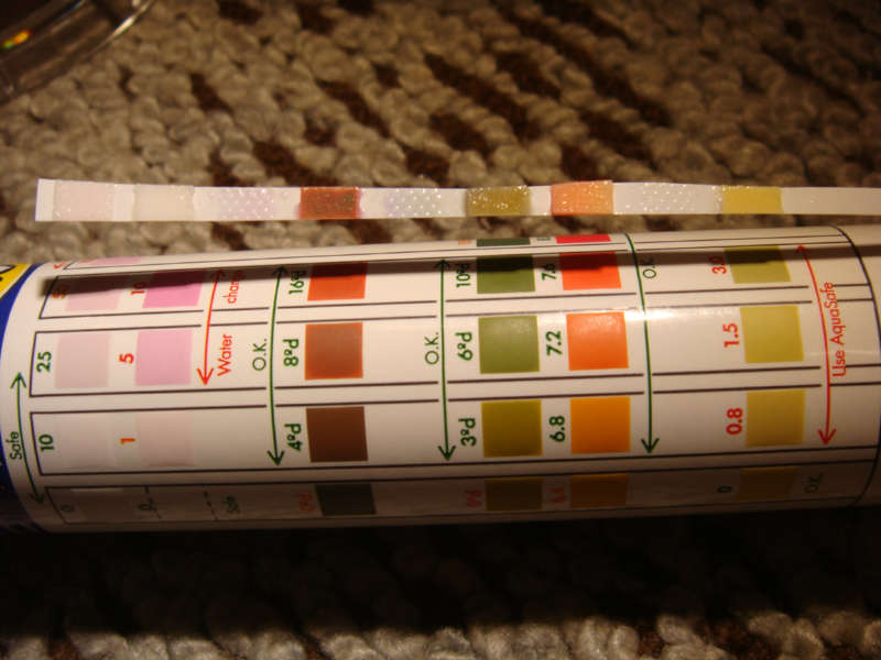 Cl2は0、pHは6.8、KHは3°d、GHは8°d、NO2-は1、NO3-は10。