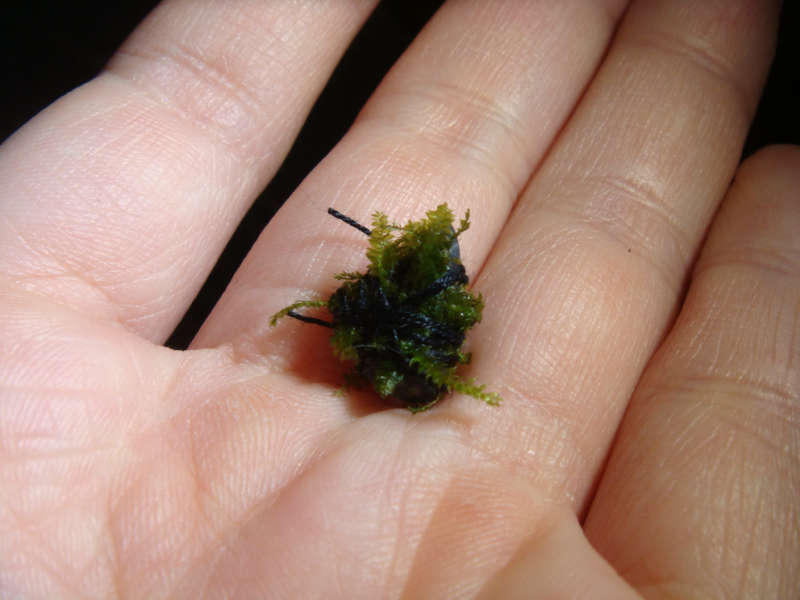 サカマキガイの容器用に、ウィローモスのカケラを底砂のひとつに巻き付けてウィローモス石を作成。