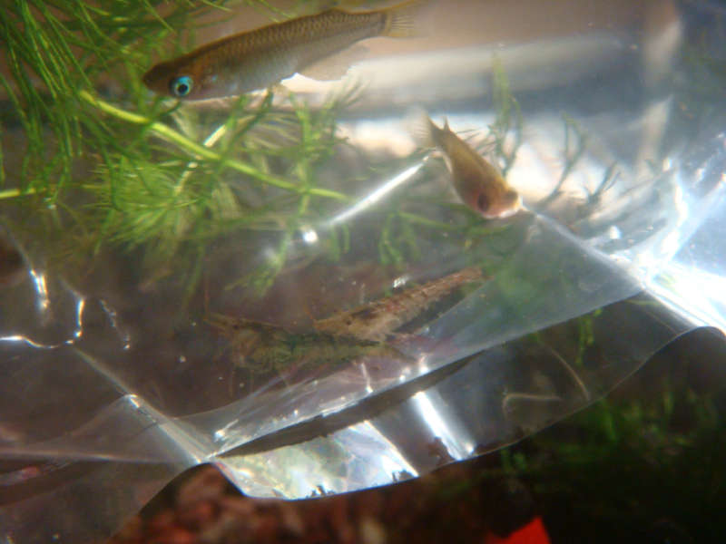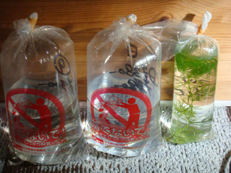 ビニール袋の口の輪ゴムはそのままにして開けずに、水槽に投入して30分以上置いておくのが本来のやり方なんですが…。