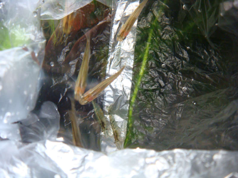 2010100104.JPGミナミヌマエビ10匹。非常にすばしっこく、またビニール袋を入れていた袋から出した衝撃に動揺したのか、うまく写らないくらいにピンピン動いてましたが…。